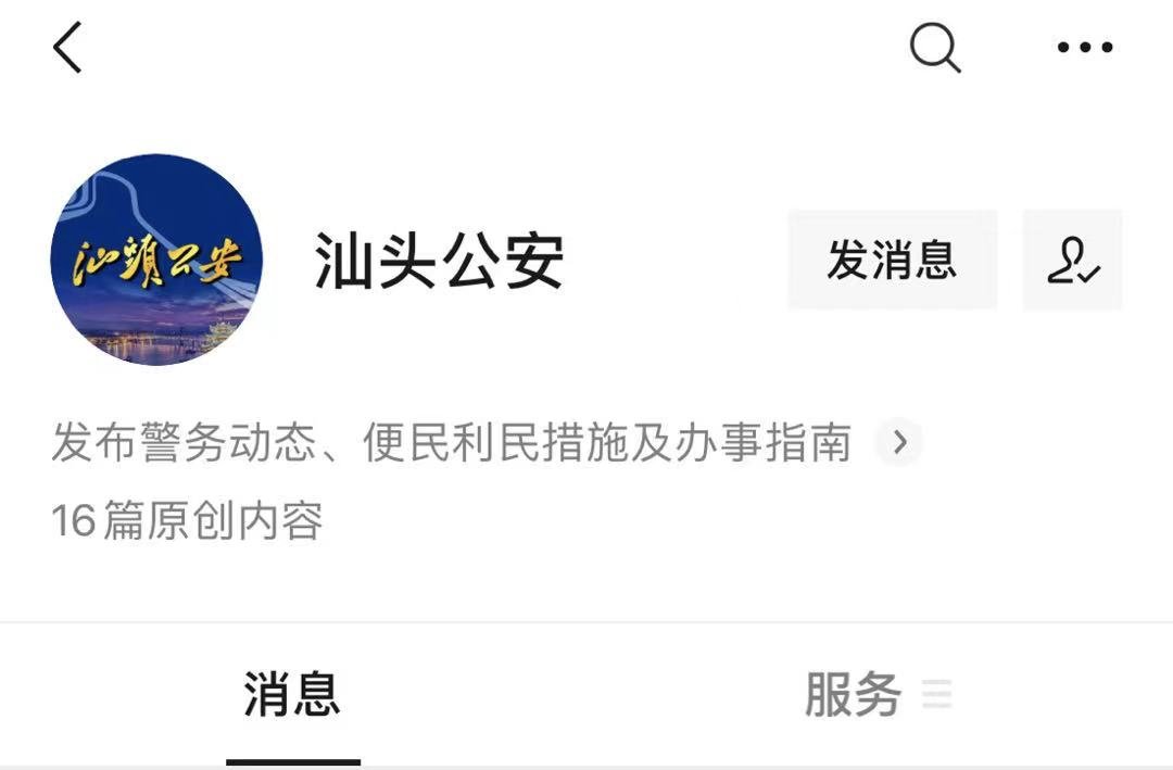 公众号搜索“汕头公安”或微信框搜索“汕头公安”公众号。