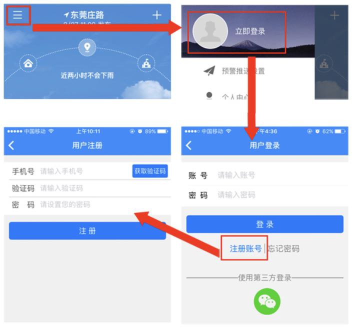 ① 注册和登录方式一:使用手机号码注册。点击屏幕左上角的“≡”进入设置页面,点击上方的头像和立即登录区域,进入登录界面,点击“注册账号”,输入您的手机号码、验证码和密码即可。