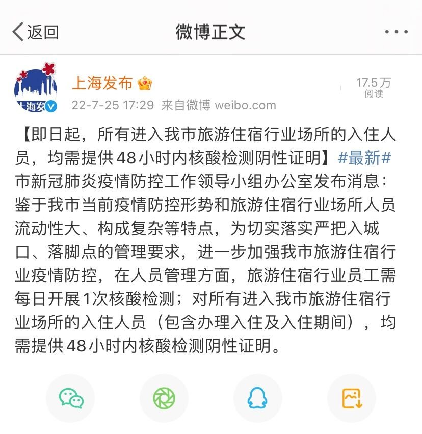 上海市新冠肺炎疫情防控工作领导小组办公室发布消息:自2022年7月25日起,所有进入上海市旅游住宿行业场所的入住人员(包括办理入住和入住期间),均需提供48小时内核酸检测阴性证明。