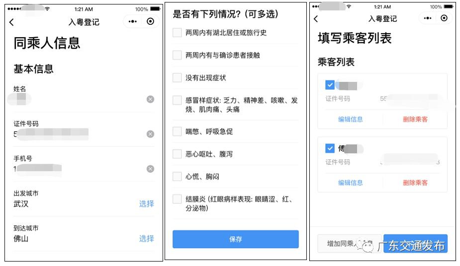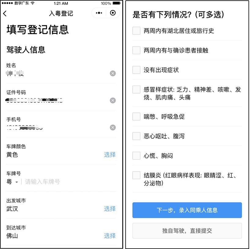 驾驶员:在粤省事实名认证后,登记车牌号、出发地目的地,勾选是否途经湖北,并添加乘车人(姓名、身份证)的部分或者全部信息