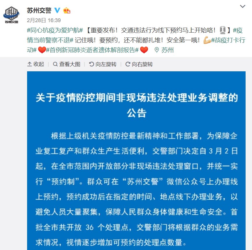 据苏州交警微博消息,为保障企业复工复产和群众生产生活便利苏州市公安局交通警察支队决定自3月2日起,在全市范围内开放部分非现场违法处理点,并统一实行“预约制”,全市首批开放的处理点共36个。