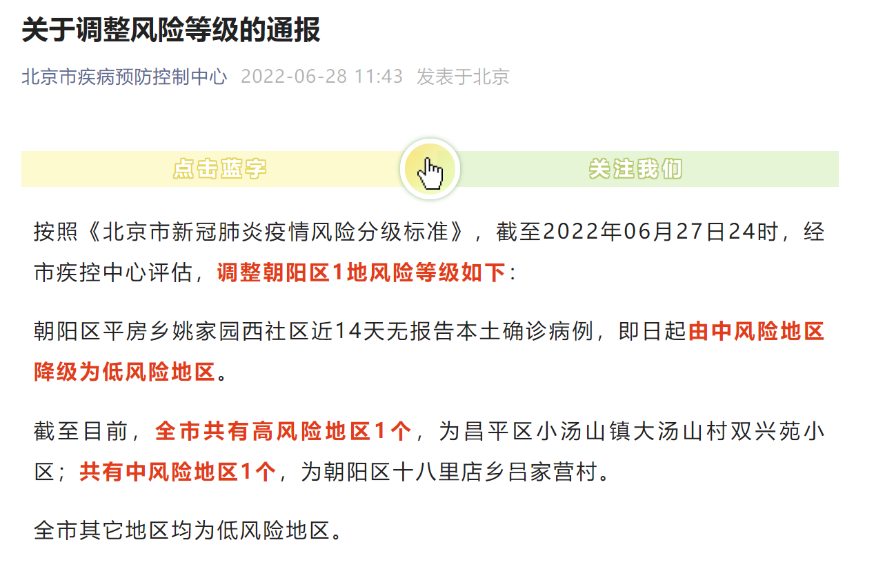 2022年6月28日北京风险等级调整通报 今天北京风险等级最新通知