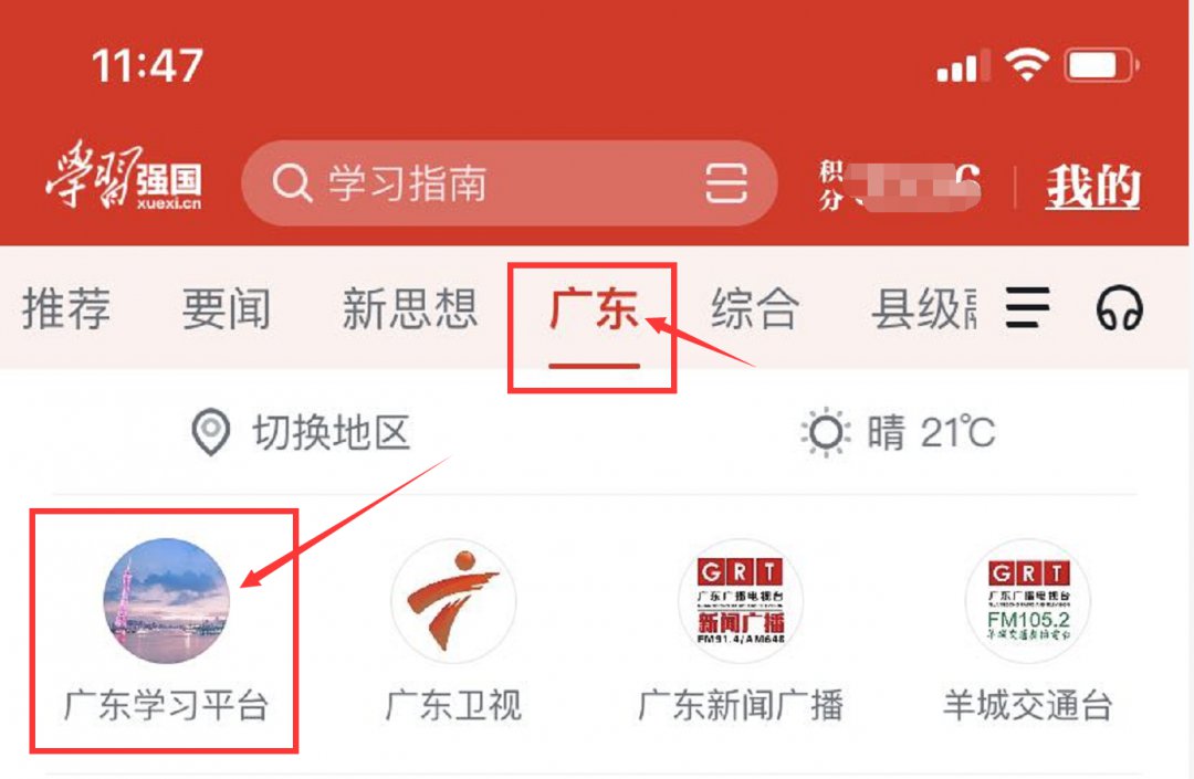 登录“学习强国”后,在上方频道栏点击“广东”,然后点击进入下面的“广东学习平台”;