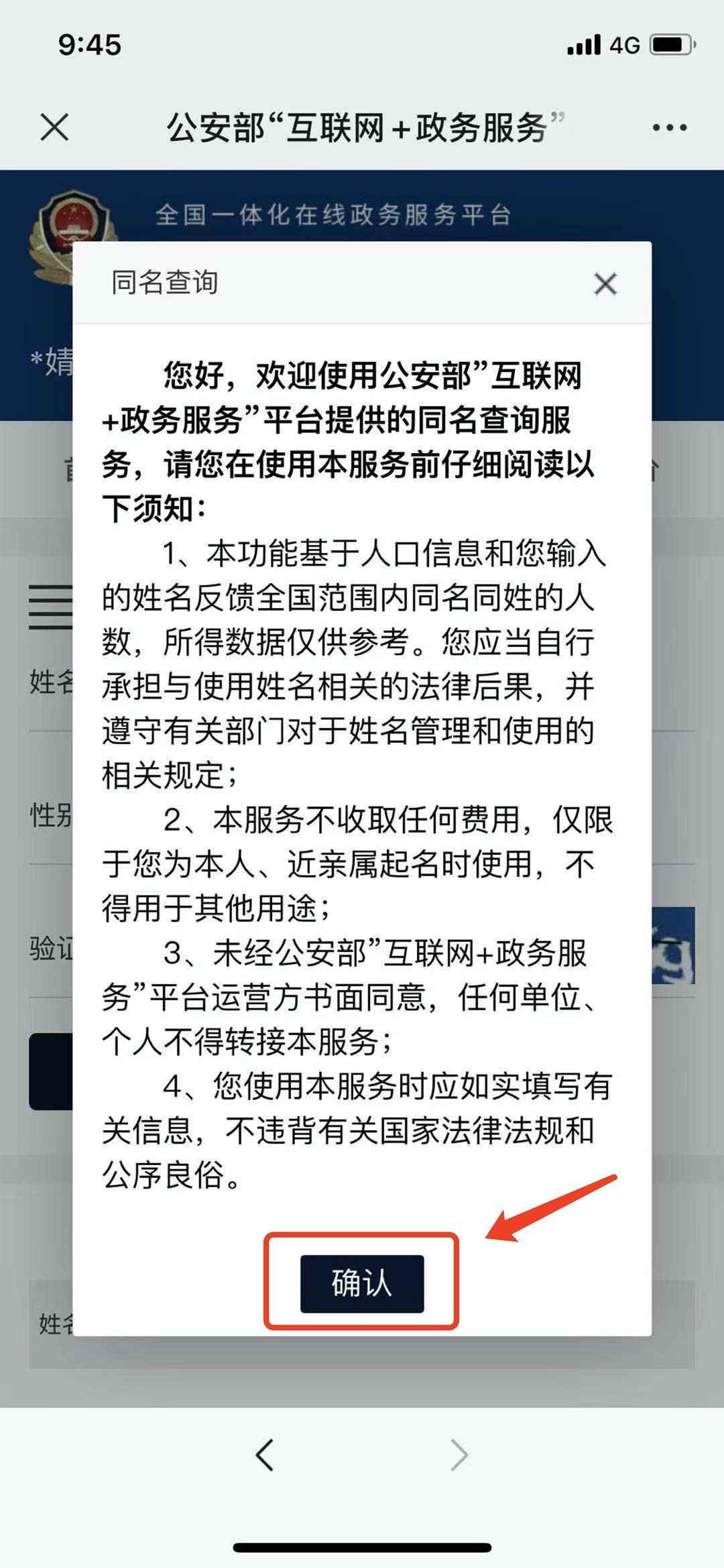 3.登陆成功后,仔细阅读同名查询须知,点击【确定】。