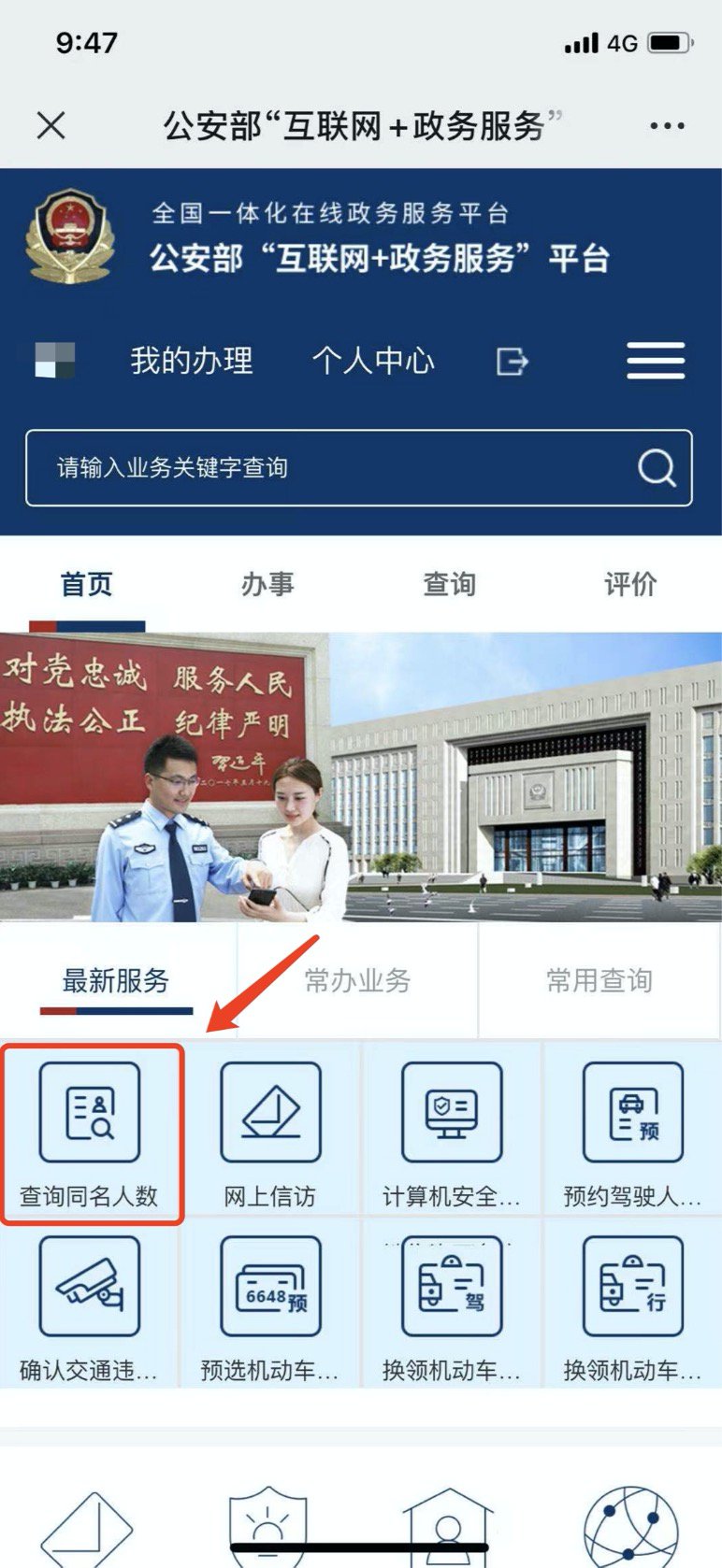 1.进入公安部“互联网+政务服务”平台,点击首页【查询同名人数】板块。