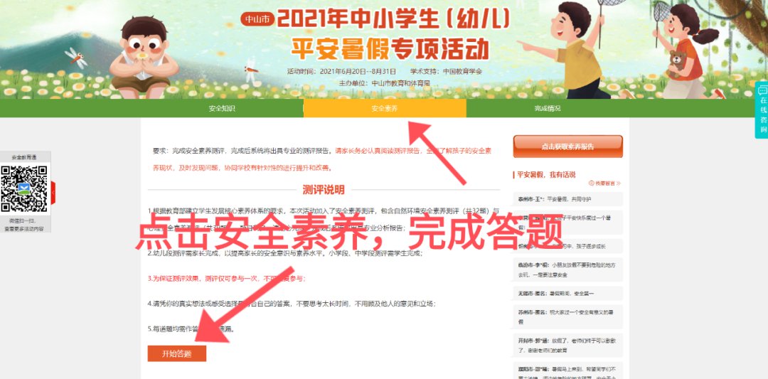 第二步:学习暑假安全知识,建议参与安全素养测评,完成后点击提交即可。