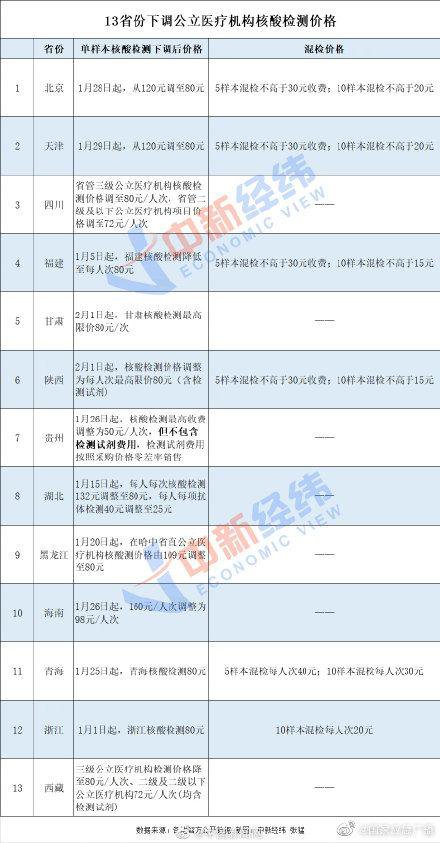 今年春节,核酸检测成返乡“通行证”。2021年来,已有北京、天津、四川、福建、甘肃、陕西、贵州、湖北、黑龙江、海南、青海、浙江、西藏13省份公立机构下调核酸检测费用。有9省份单样本公立机构核酸检测最高限价下调至80元/次。此外,北京、陕西、保定等地核酸检测费用纳入医保。
