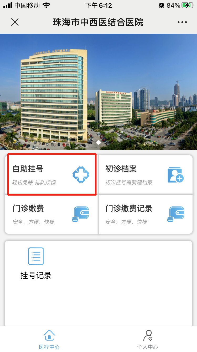 微信搜索进入【珠海市中西医结合医院】公众号,点击菜单栏【门诊服务】,选择【预约挂号】;