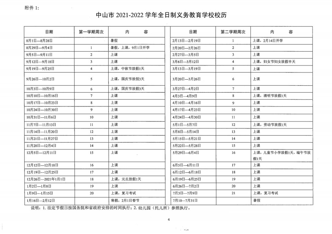 中山市2021-2022学年全日制义务教育学校校历