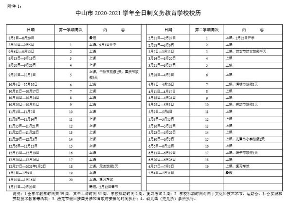 中山市2020-2021学年全日制义务教育学校校历
