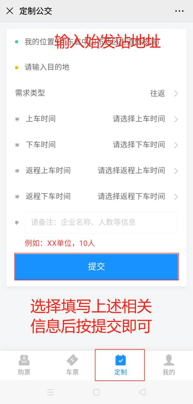 填写提交通勤需求:乘车出发站点、目的地站点、乘车时间、乘车人数等。
