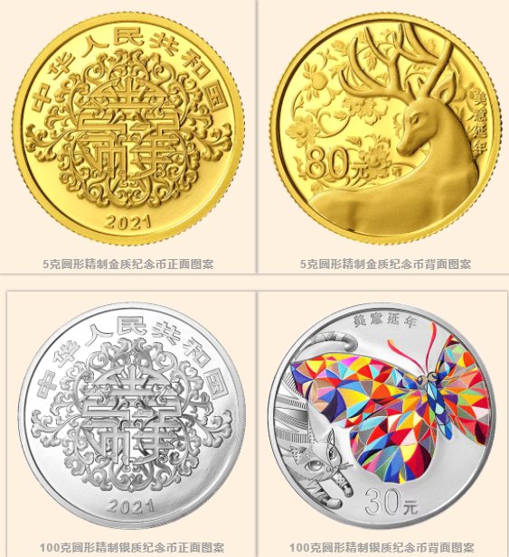 中国人民银行自2021年5月9日起发行2021吉祥文化金银纪念币一套。该套金银纪念币共7枚,其中金质纪念币3枚,银质纪念币4枚,均为中华人民共和国法定货币。