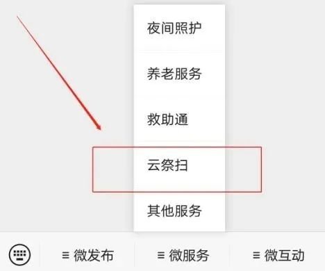 1、微信搜索“苏州民政”,在公众号下方的菜单栏中点击“微服务”-“云祭扫”;