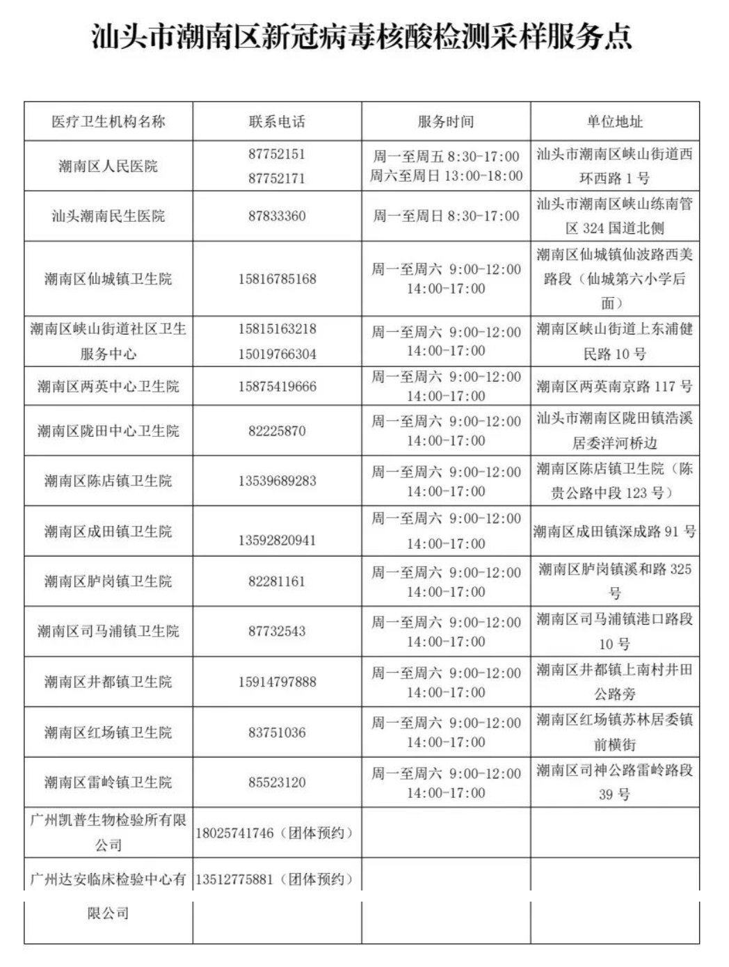 根据国务院联防联控机制工作部署,从即日起,跨省份返乡人员、来自省内中高风险区域所在地市的返乡人员(中高风险区域内部人员原则上不流动)和省内的进口冷链食品从业人员、口岸直接接触进口货物从业人员、隔离场所工作人员、交通运输工具从业人员等重点人群返乡,需持“7天内有效新冠病毒核酸检测阴性结果返乡”。为服务在潮南区工作确需返乡人员,确保核酸检测规范有序进行,我区设立多个新冠病毒核酸检测采样服务点,现就有关事项通知如下: