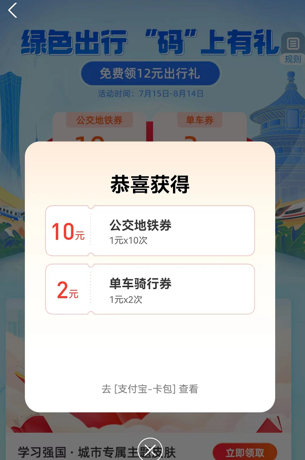 活动期间,通过支付宝搜索“1039”,还能在活动页面抽取城市名片出行皮肤,后续将会有中国国家地理景观授权的“长城”、“天坛”两款城市名片出行皮肤加入,等您来拿!“城市名片”系列出行皮肤是由支付宝联名中国国家地理景观推出的,系列皮肤结合中国国家地理·景观的地标作品,推出了一系列具有城市文化特色的皮肤作品。您获得的皮肤权益将展示在“支付宝”-“出行”-“管理”-“出行皮肤管理”内。