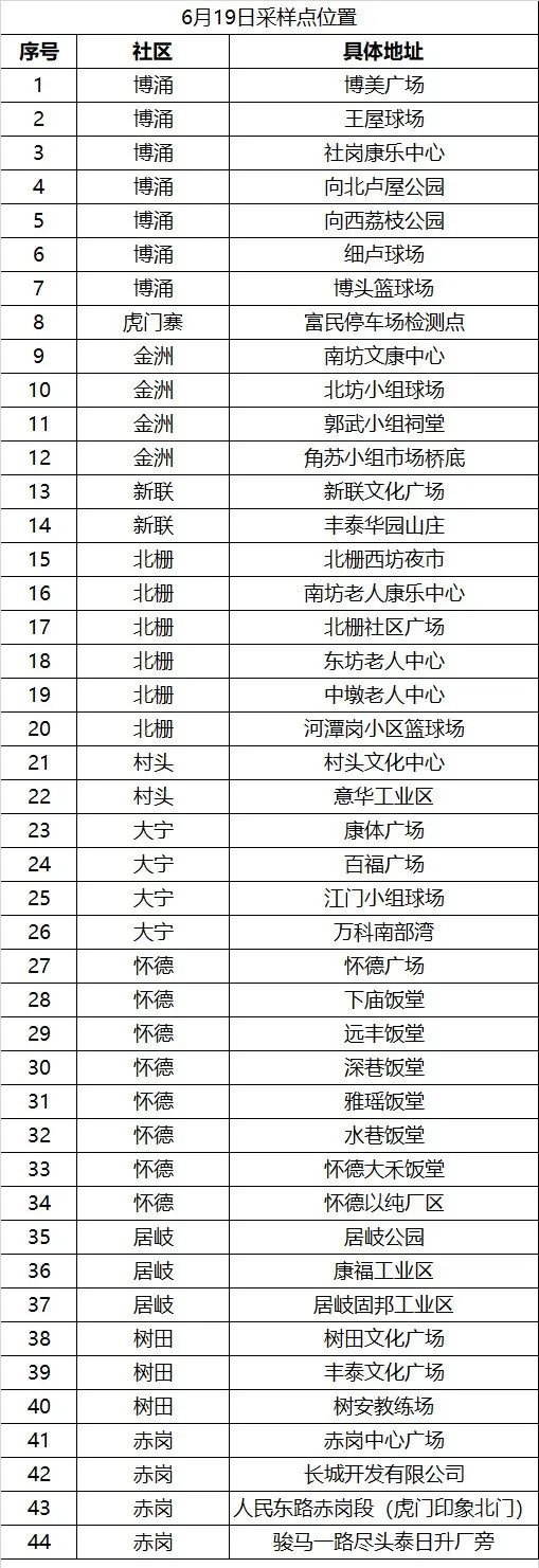 一、检测区域:树田、怀德、居岐、村头、大宁、北栅、赤岗、博涌、新联、虎门寨、金洲等11个社区。