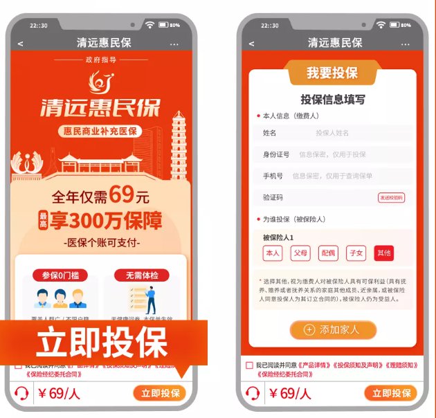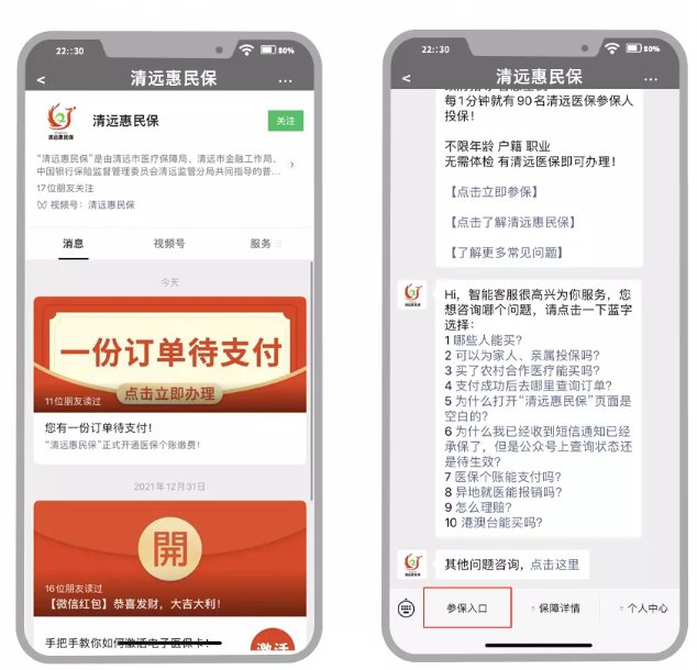 1.微信搜索清远惠民保,进入公众号界面点击参保入口,进入投保页面