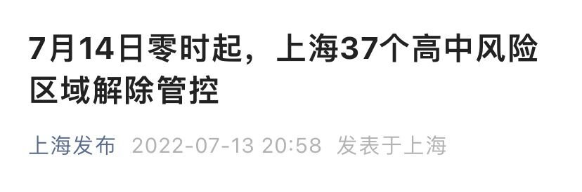 上海市新冠肺炎疫情防控工作领导小组办公室发布消息:根据国家第九版新冠肺炎疫情防控方案要求,经市新冠肺炎疫情防控工作领导小组办公室研究决定,自2022年7月14日零时起,将以下37个高中风险区域解除管控: