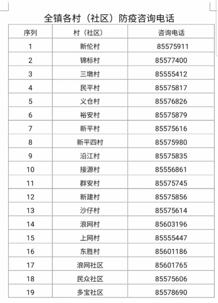 2月7日,民众镇疫情防控指挥部发布公告:从疫情发生地返回民众镇的本地居民及外来人员,必须在1小时内主动到所在村(社区)进行登记、报备或通过二维码自行申报。若不执行,要承担相应法律责任。民众镇还公布了各村(社区)防疫咨询电话。
