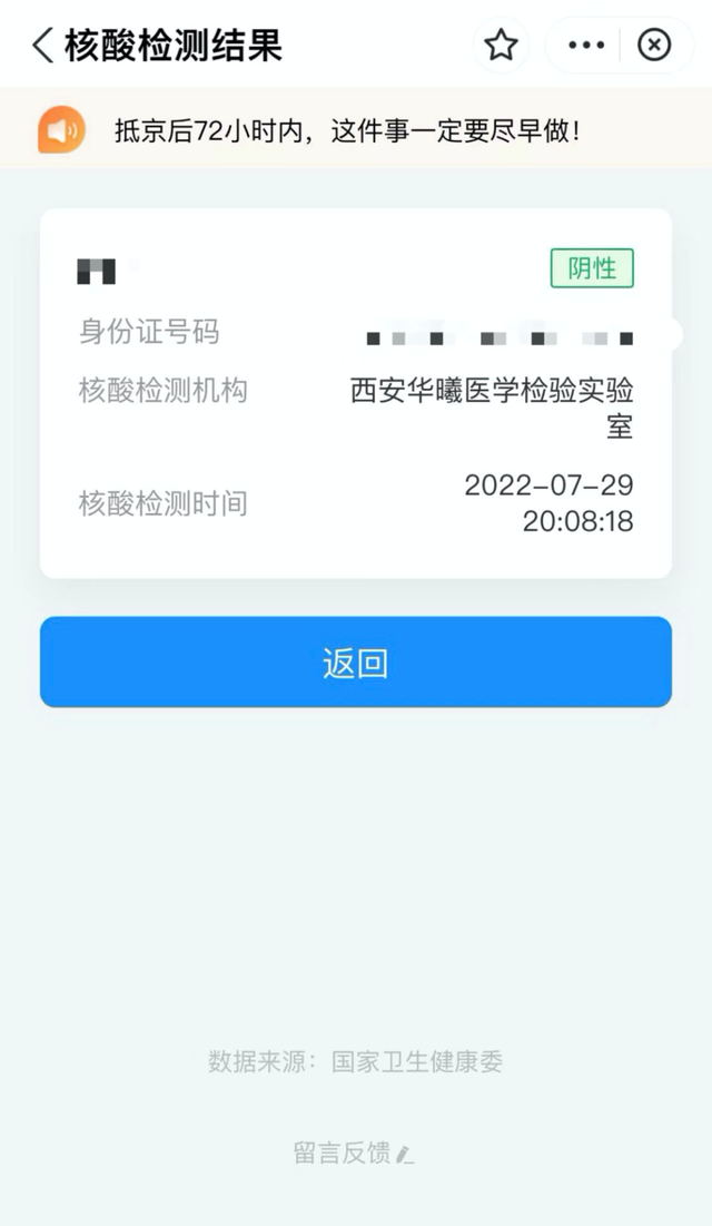 这时页面出现在外省市测的核酸的检测结果,随后点击“返回”