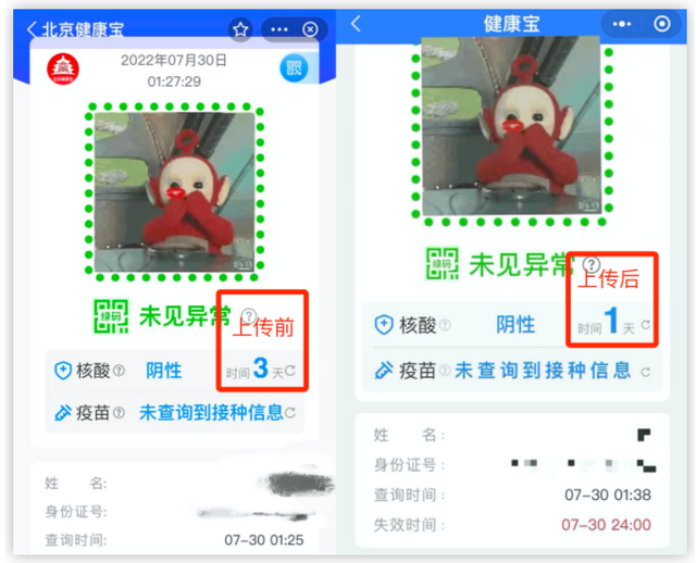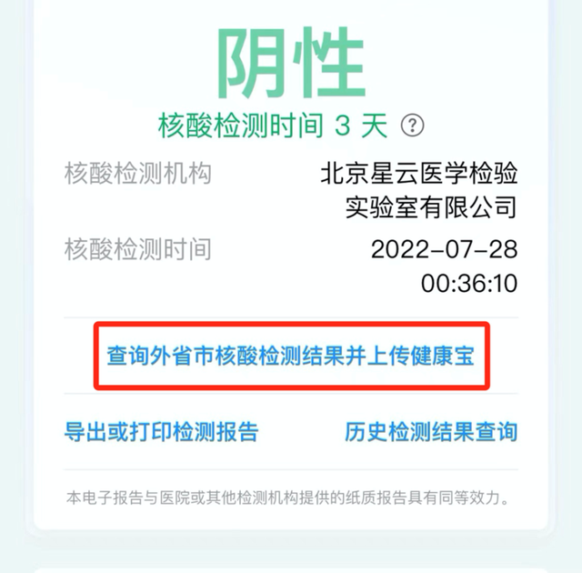 7月30日凌晨,北京健康宝上,可以查询外省市核酸检测结果并上传健康宝了。