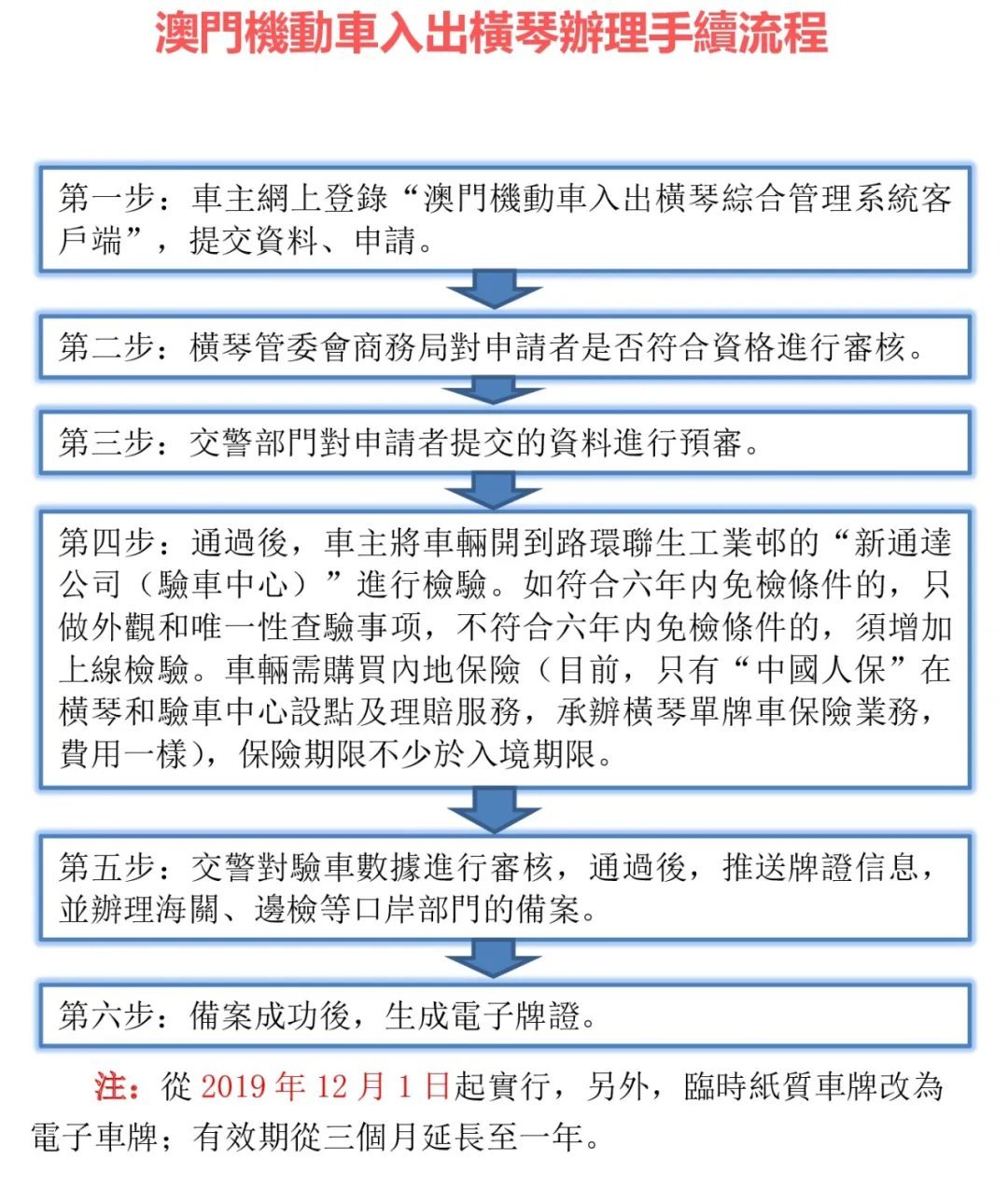 申请流程:澳门居民如需办理澳门机动车入出横琴申请或咨询相关信息,可登陆澳门机动车入出横琴通关申请网站,或致电澳门机动车入出横琴申报大厅咨询热线(电话:0086756-8841835、0086756-8841875)。