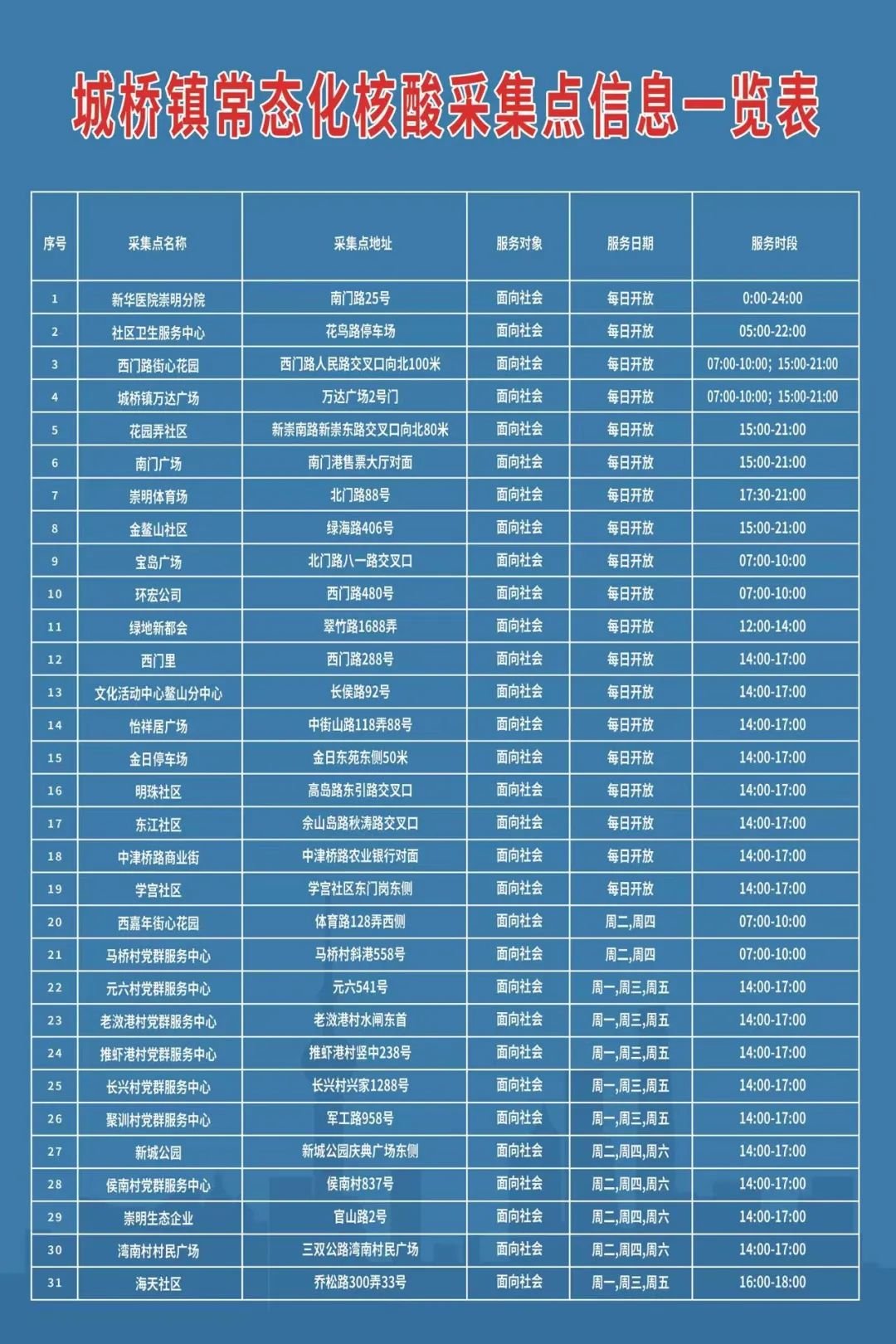 截至2022年6月29日,崇明区城桥镇已开设62个常态化核酸采集点,其中面向社会开放的采集点31个(详见一览表)。