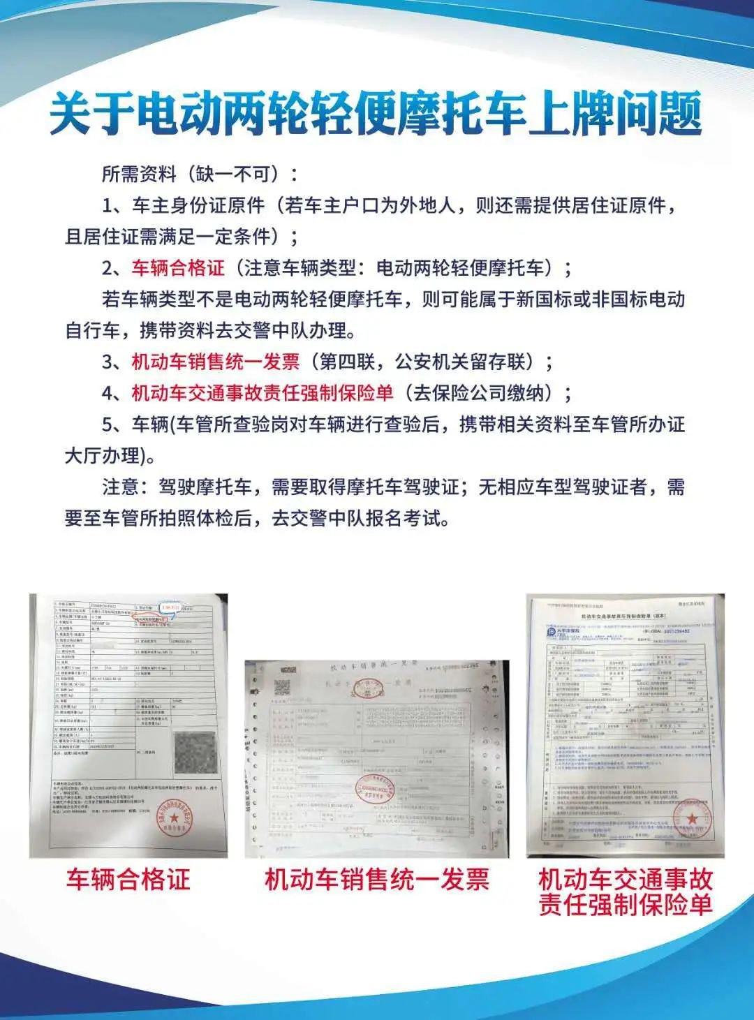 请广大市民以购车发票和合格证标注的车辆型号为准,电动轻便二轮摩托车虽然和电动自行车长得很像,但属于摩托车,必须到车管所上摩托车号牌,同时必须持有摩托车驾驶证,并且购买交通强制险。
