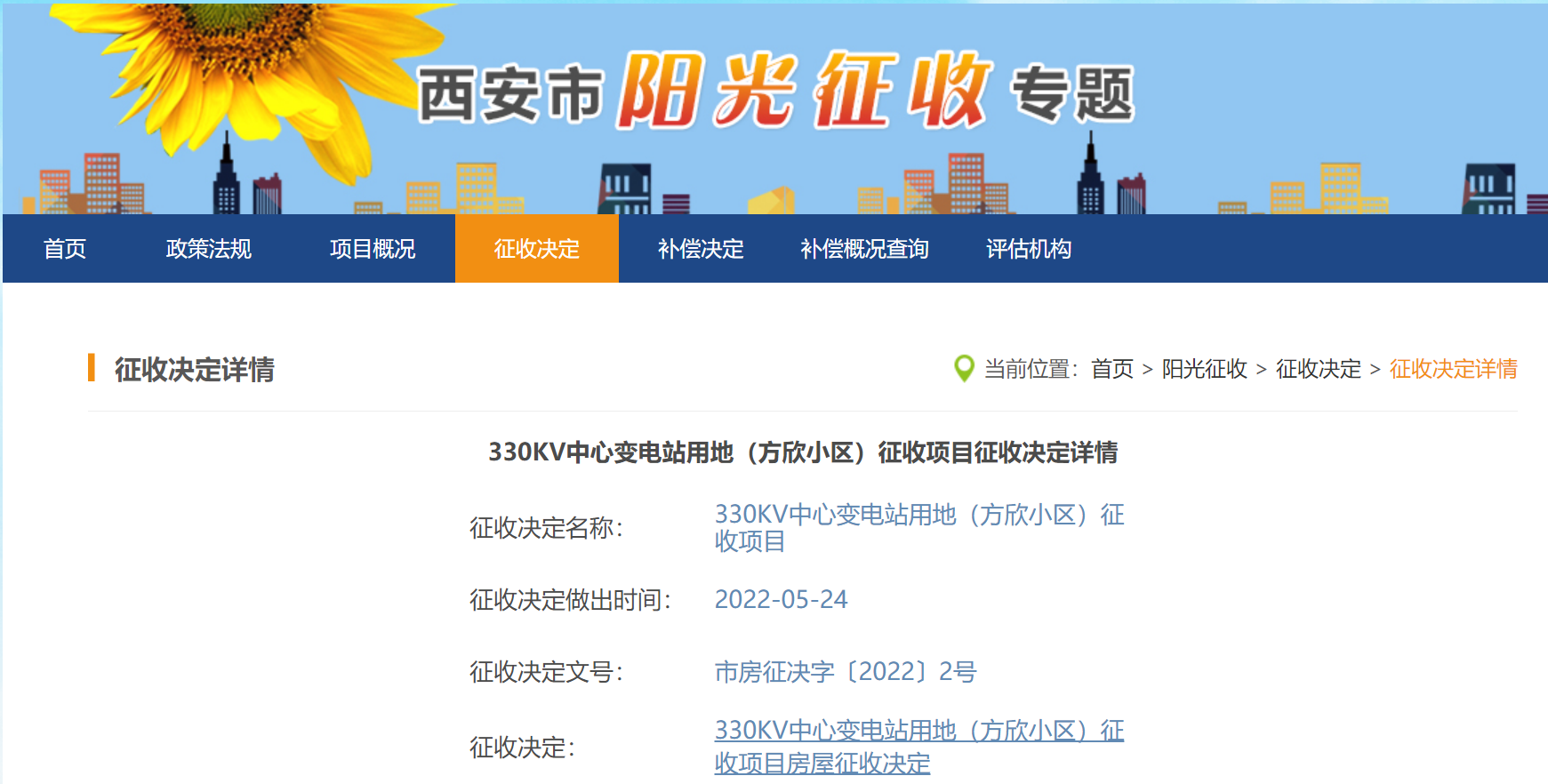 为保障330KV中心变电站用地(方欣小区)征收项目建设需要,根据国务院《国有土地上房屋征收与补偿条例》第八条、《西安市国有土地上房屋征收与补偿办法》第九条的规定,西安市人民政府委托西安曲江新区管理委员会决定对330KV中心变电站用地(方欣小区)征收项目涉及国有土地上的房屋予以征收。