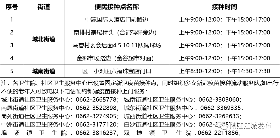 江城区5月23日新冠疫苗便民接种服务点安排如下: