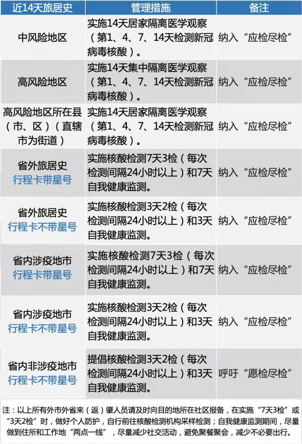 注意:根据省要求,对近14天有上海市全域、吉林省全域旅居史人员实施“7天居家隔离+7天居家健康监测”,第1、4、7、14天检测新冠病毒核酸。