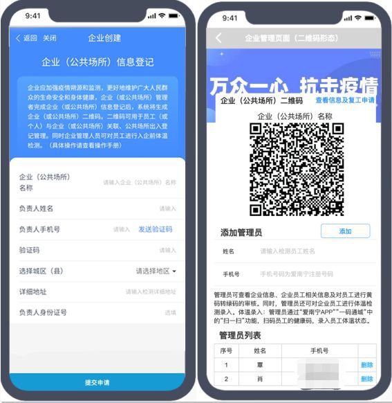 1、在健康码页面下方进入“企业管理入口”,点击“添加管理员”,输入需要添加的管理员姓名及其注册手机号,点击“添加”完成管理员添加。管理员可查看企业基本信息和员工健康数据,同时可审批员工的转码申请。