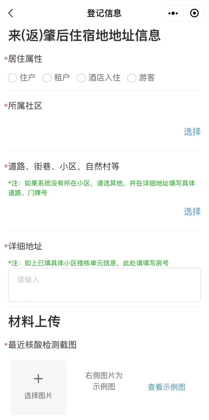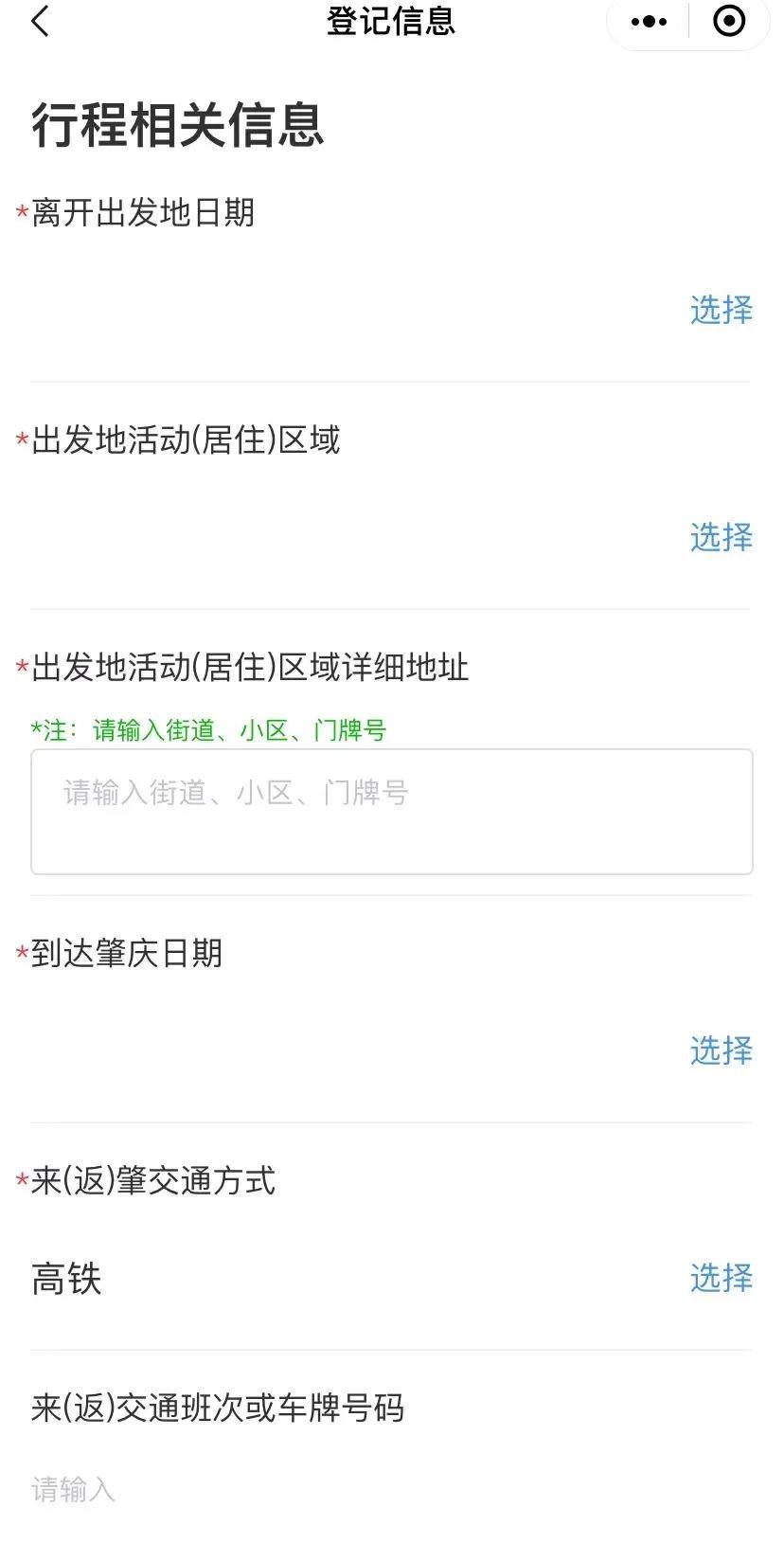 按照页面提示,根据实际依次填入行程相关信息、新冠肺炎健康问询、个人基本信息、来(返)肇后住宿地地址信息、材料上传。
