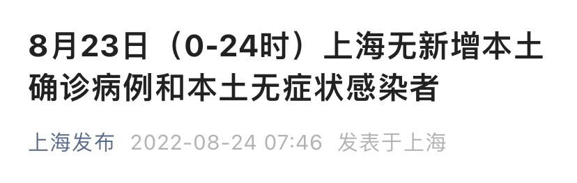 上海市卫健委8月24日通报:2022年8月23日0—24时,上海无新增本土确诊病例和无症状感染者。