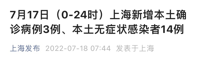 上海市卫健委7月18日通报:2022年7月17日0—24时,新增本土确诊病例3例和无症状感染者14例,均在隔离管控中发现。
