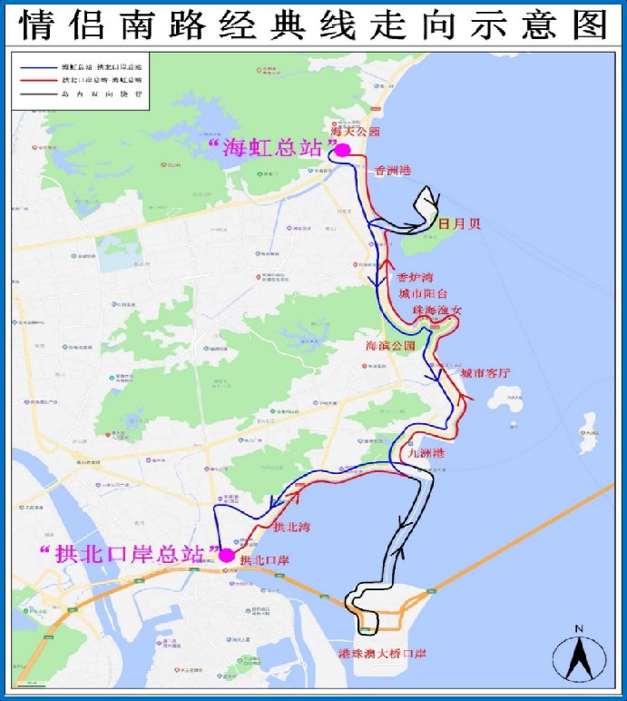 专线的起始站分别为拱北口岸总站和海虹总站,总长约52公里,全程耗时约1小时。港珠澳大桥珠海公路口岸、爱情邮局、珠海渔女、城市阳台、香炉湾、日月贝、海天公园等都在沿途。
