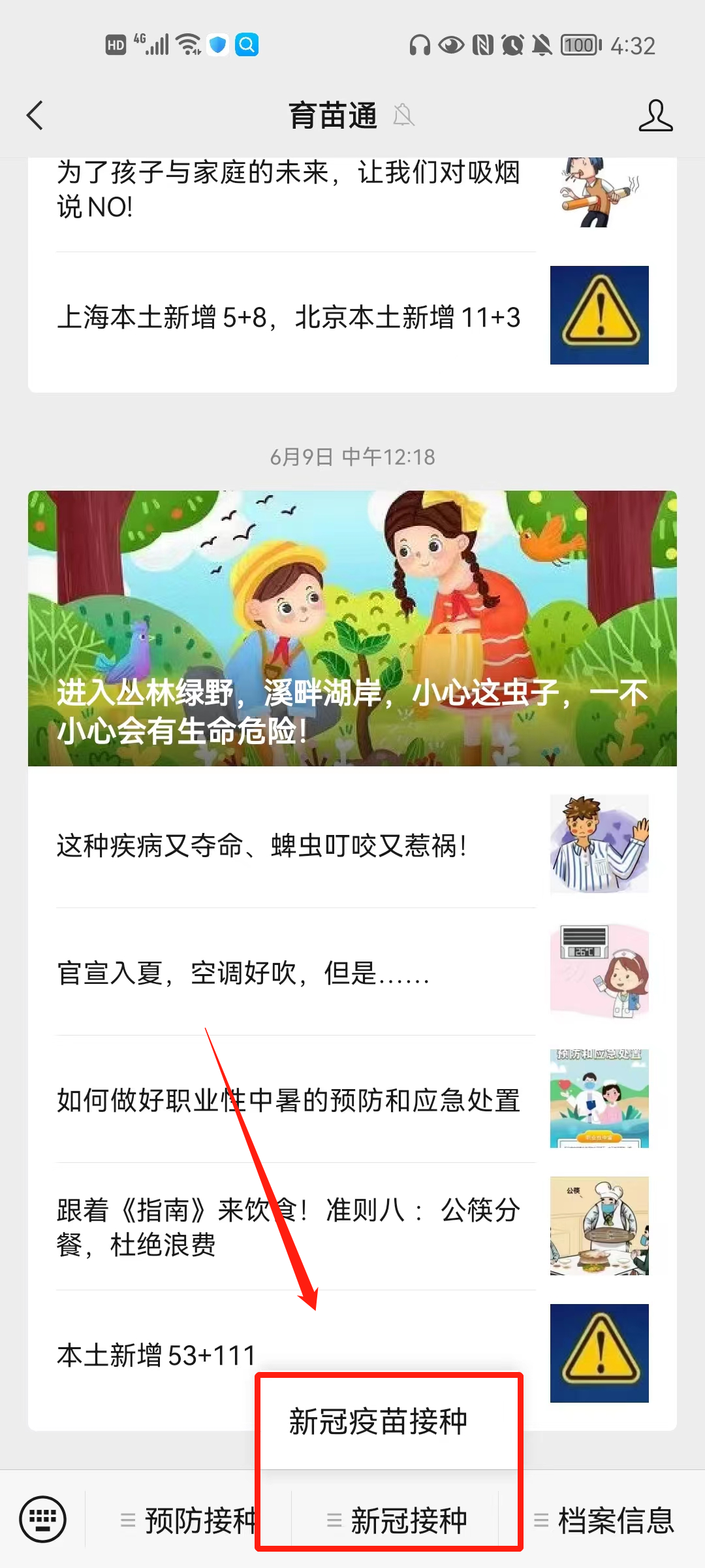 (一)进入“育苗通”微信公众号,点击“新冠疫苗”-“新冠疫苗接种”。