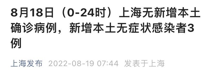 上海市卫健委8月19日通报:2022年8月18日0—24时,无新增本土确诊病例,新增本土无症状感染者3例,均在隔离管控中发现。