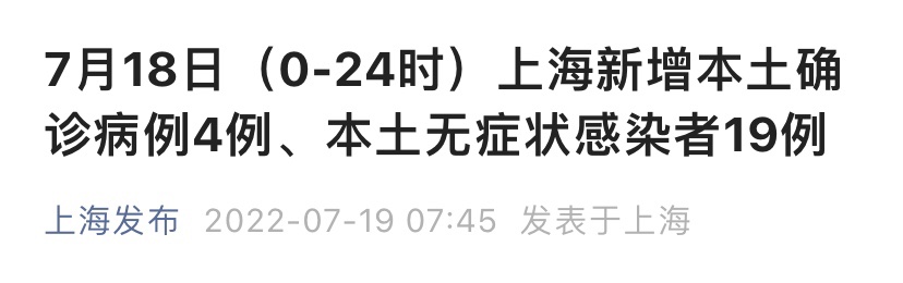 上海市卫健委7月19日通报:2022年7月18日0-24时,新增本土确诊病例4例和无症状感染者19例,均在隔离管控中发现。