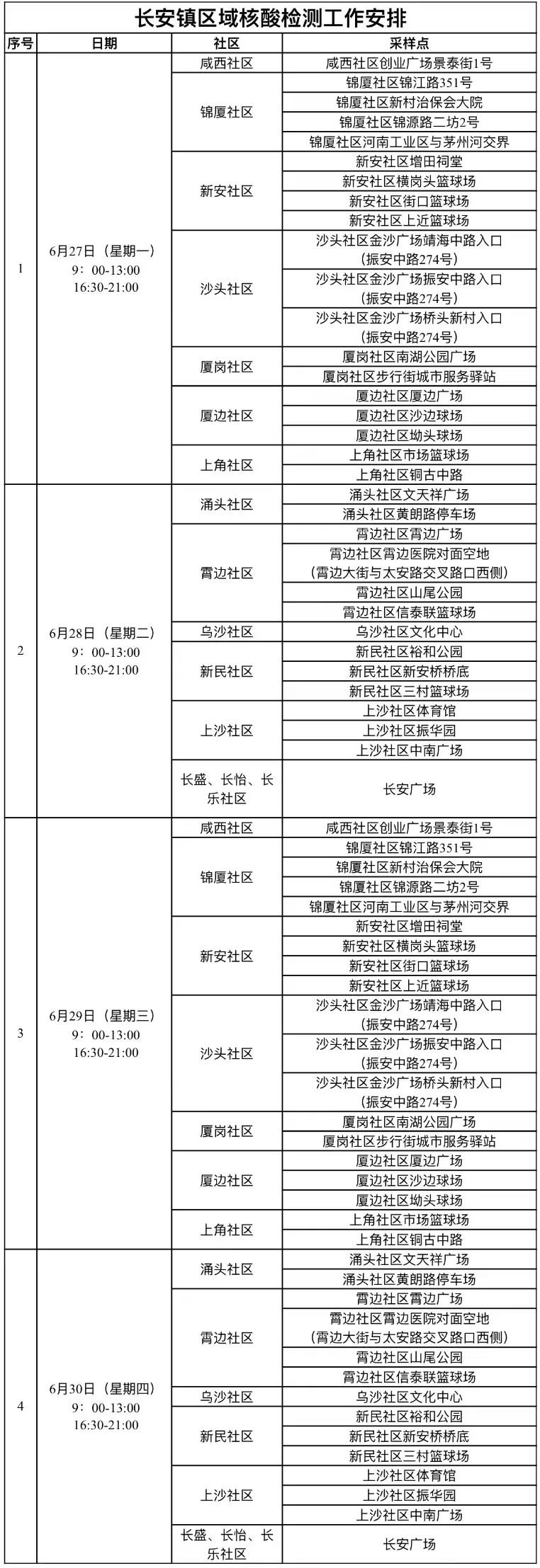 6月27日至6月30日,每天9:00-13:00和16:30-21:00,将继续分区域、分时段对全镇户籍人口、常住人口以及来(返)长安人员进行免费核酸检测(详见附表)。请市民选择就近采样点检测。