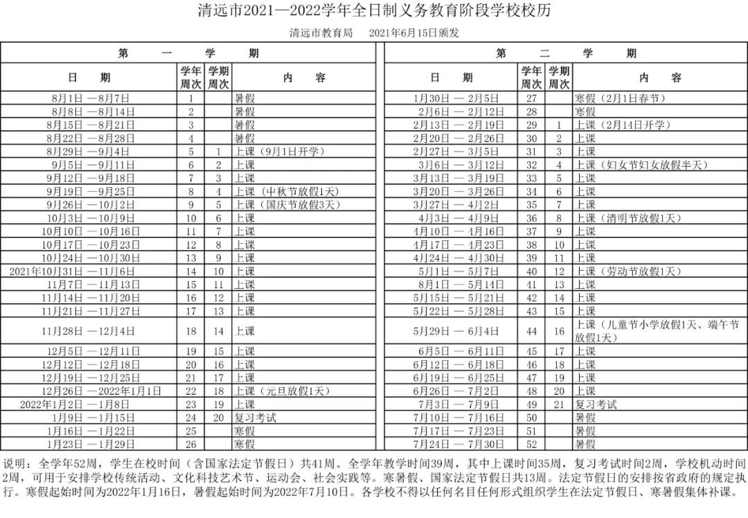 全学年52周,学生在校时间(含国家法定节假日)共41周。全学年教学时间39周,其中上课时间35周,复习考试时间2周,学校机动时间 2 周,可用于安排学校传统活动、文化科技艺术节、运动会、社会实践等。寒暑假、国家法定节假日共13周。法定节假日的安排按省政府的规定执 行。