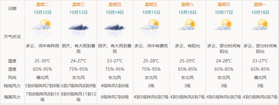 【天气趋势】受“圆规”和冷空气叠加影响,我市将再度出现持续性大风天气,其中12日夜间至13日白天海面风力可达8-9级阵风11-12级,13日及14日有明显降雨;展望15日仍有几阵骤雨,吹清劲东到东北风。温馨提醒:“圆规”影响期间我市有大风大雨,请注意防御。