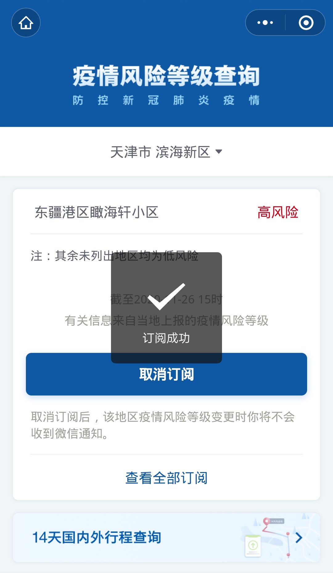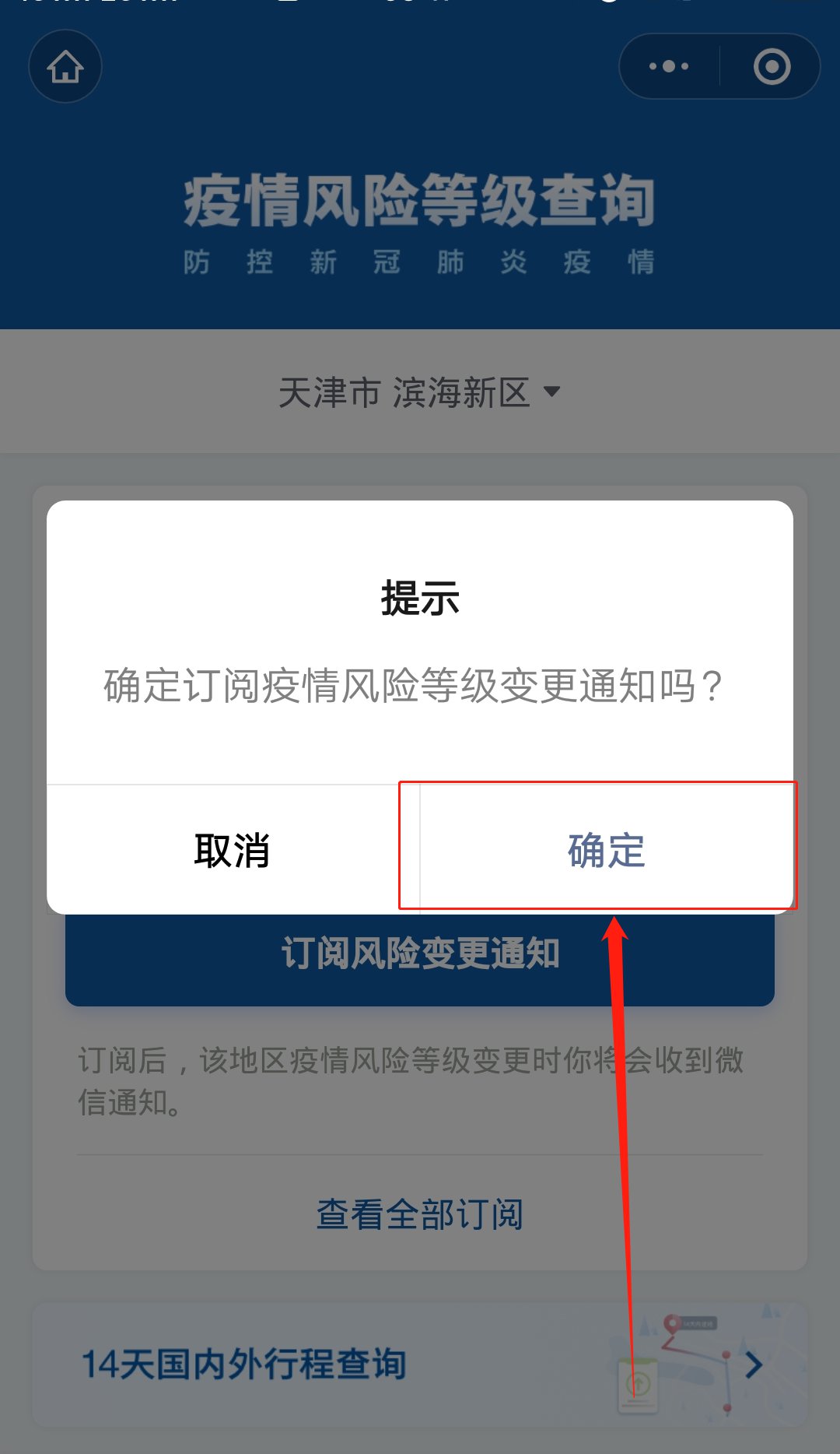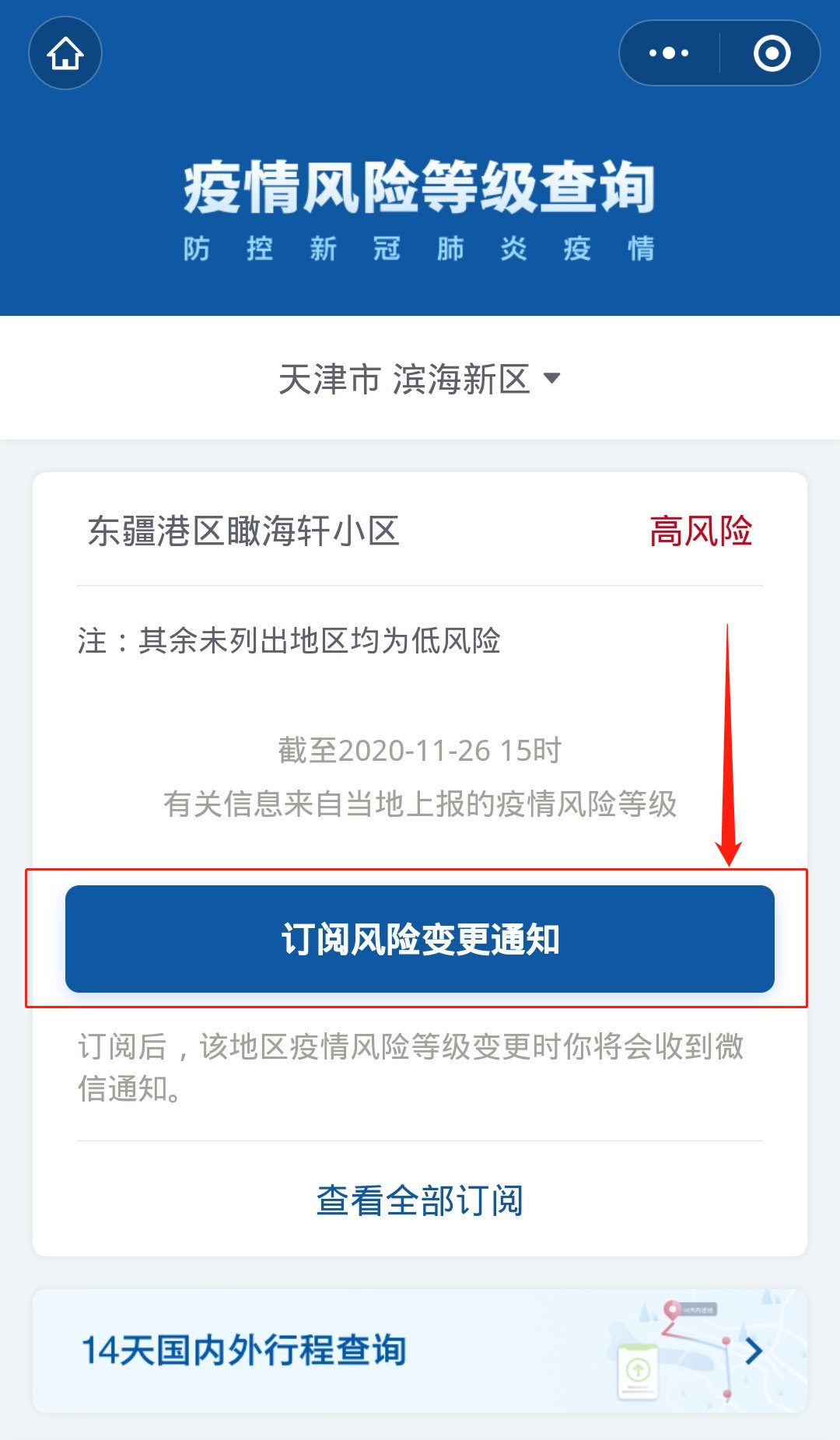第二步:选择自己需要订阅的地区风险等级,选择【订阅风险变更通知】;