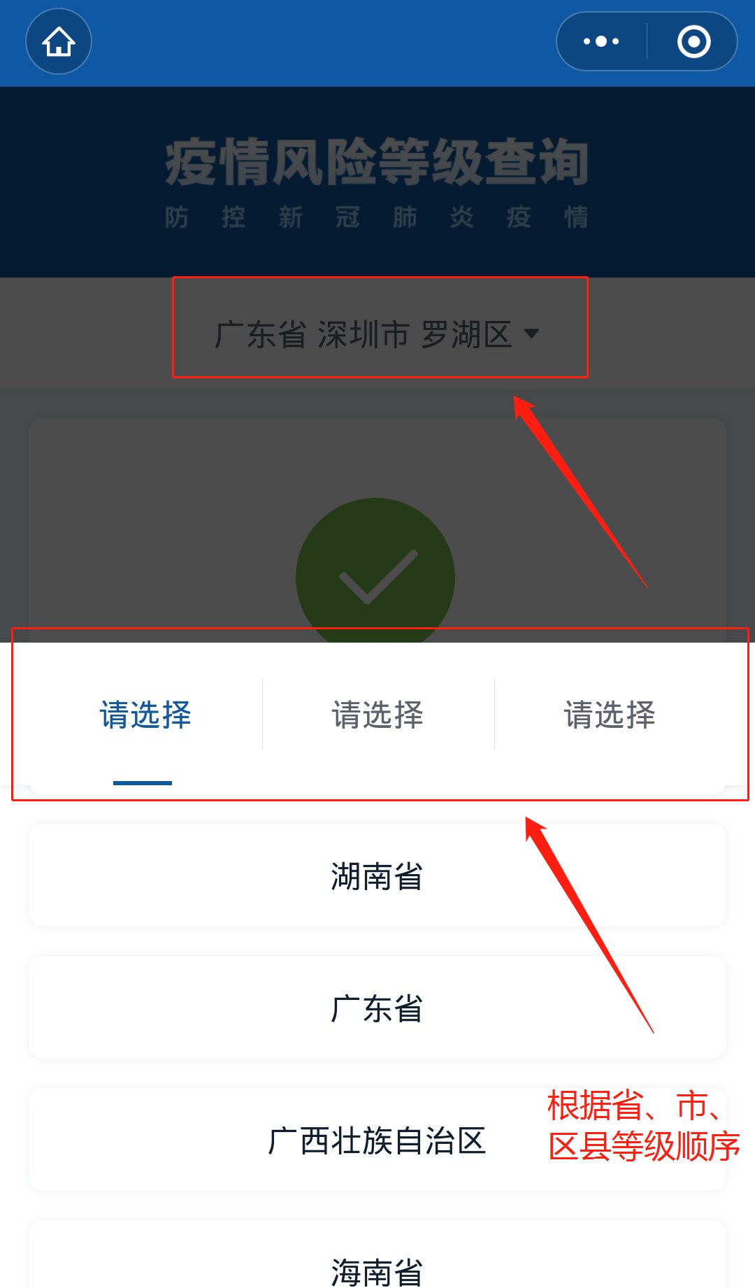 第一步:长按上方程序码进入后,在主页面选择自己需要查询的地区。