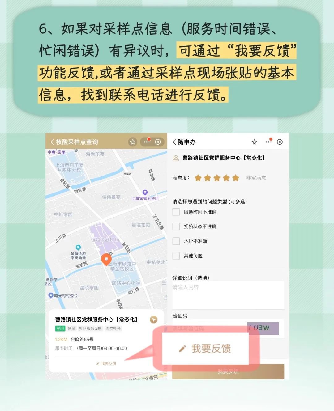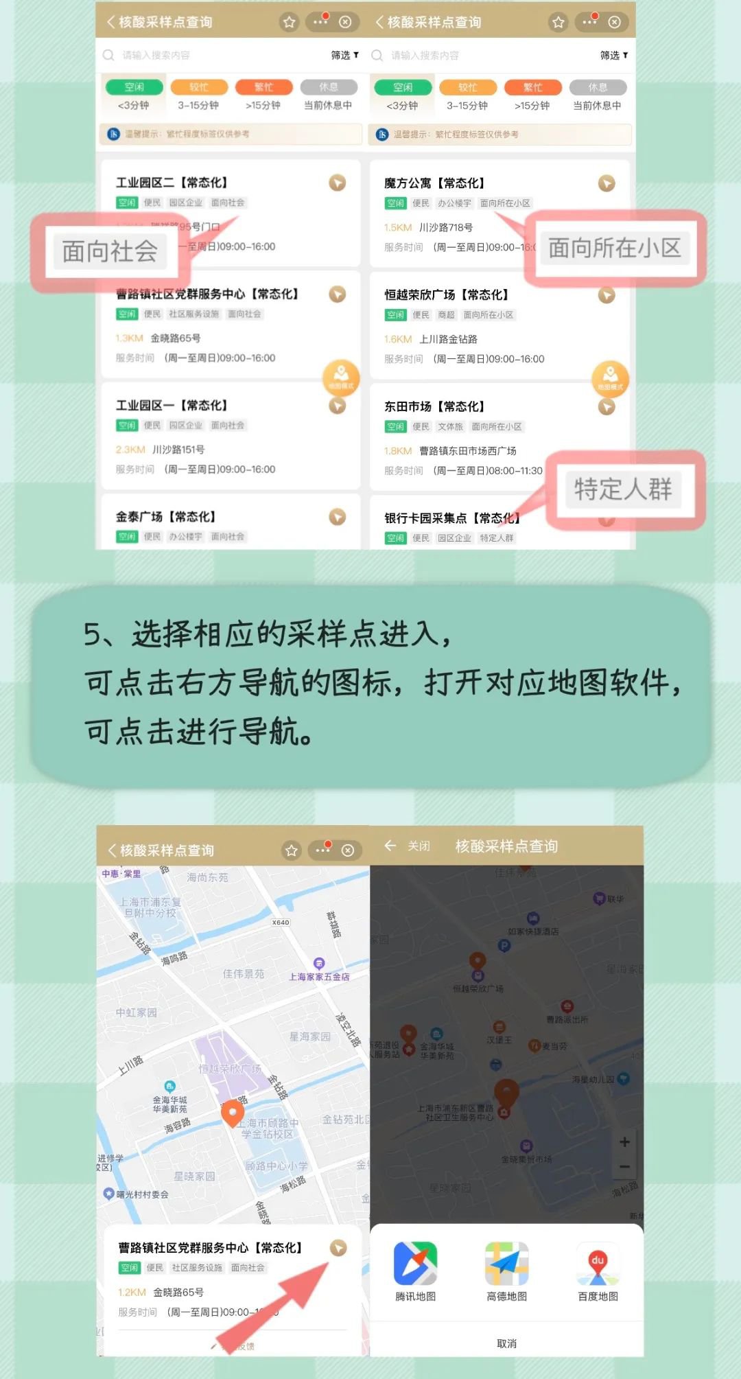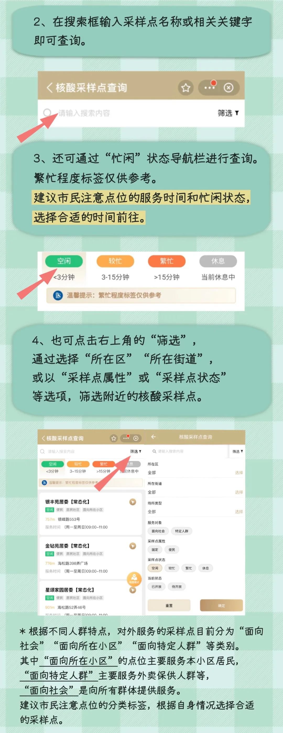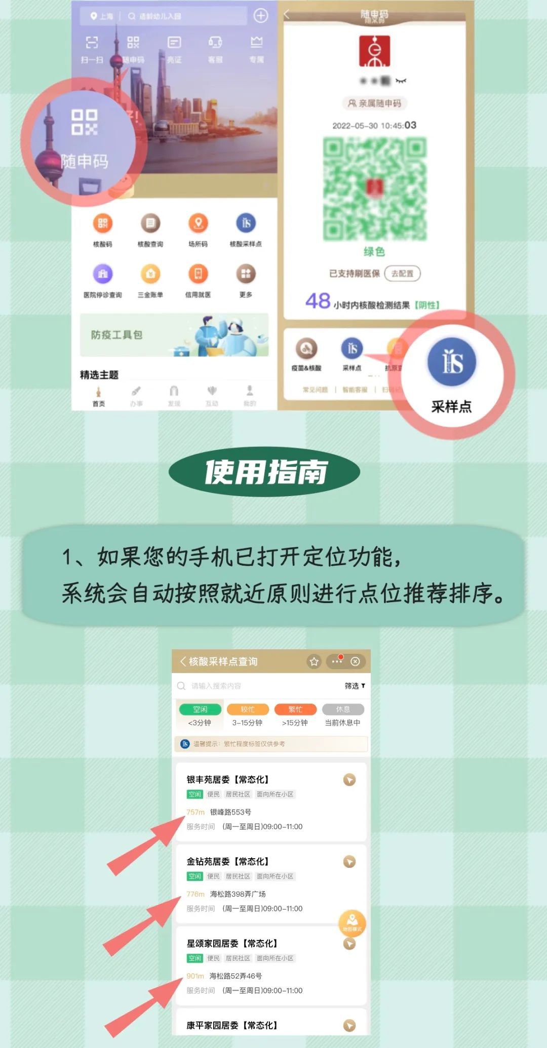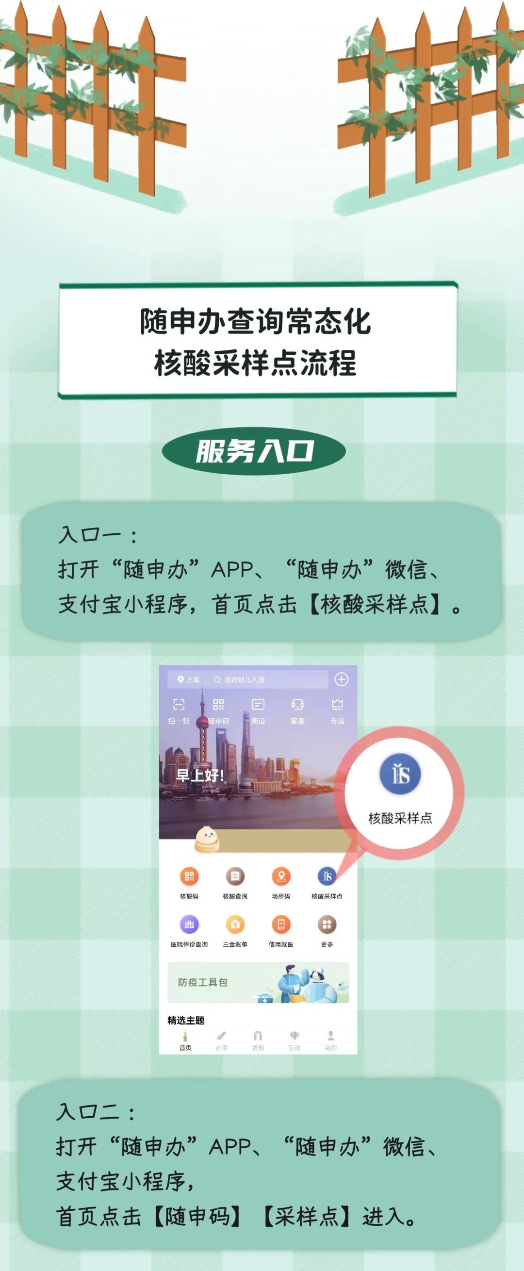 服务入口:打开“随申办”APP、“随申办”微信、支付宝小程序,首页点击【核酸采样点】进入。