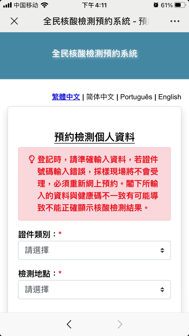 第二步:填写预约检测个人资料,包括证件、检测地点等相关信息