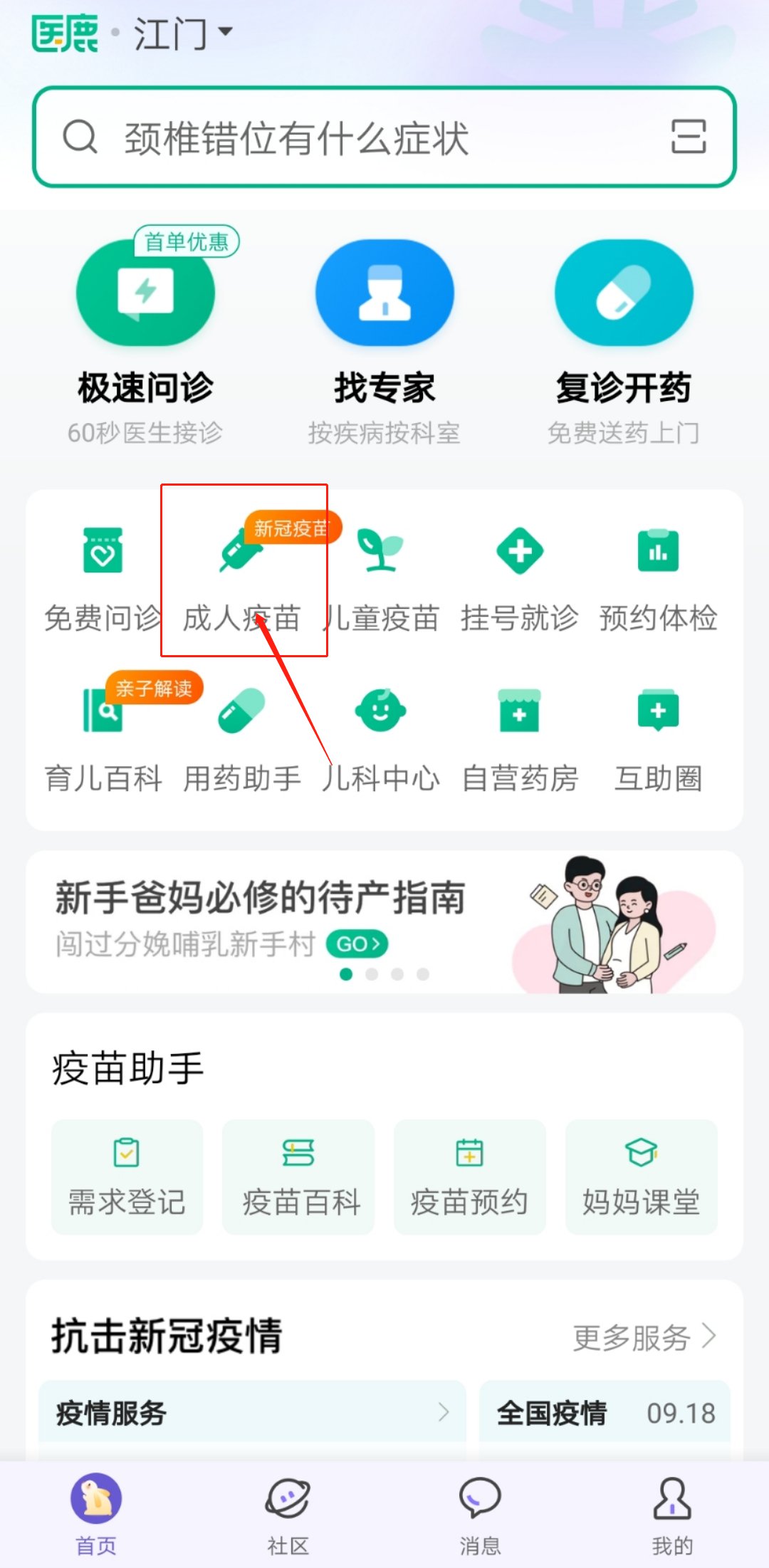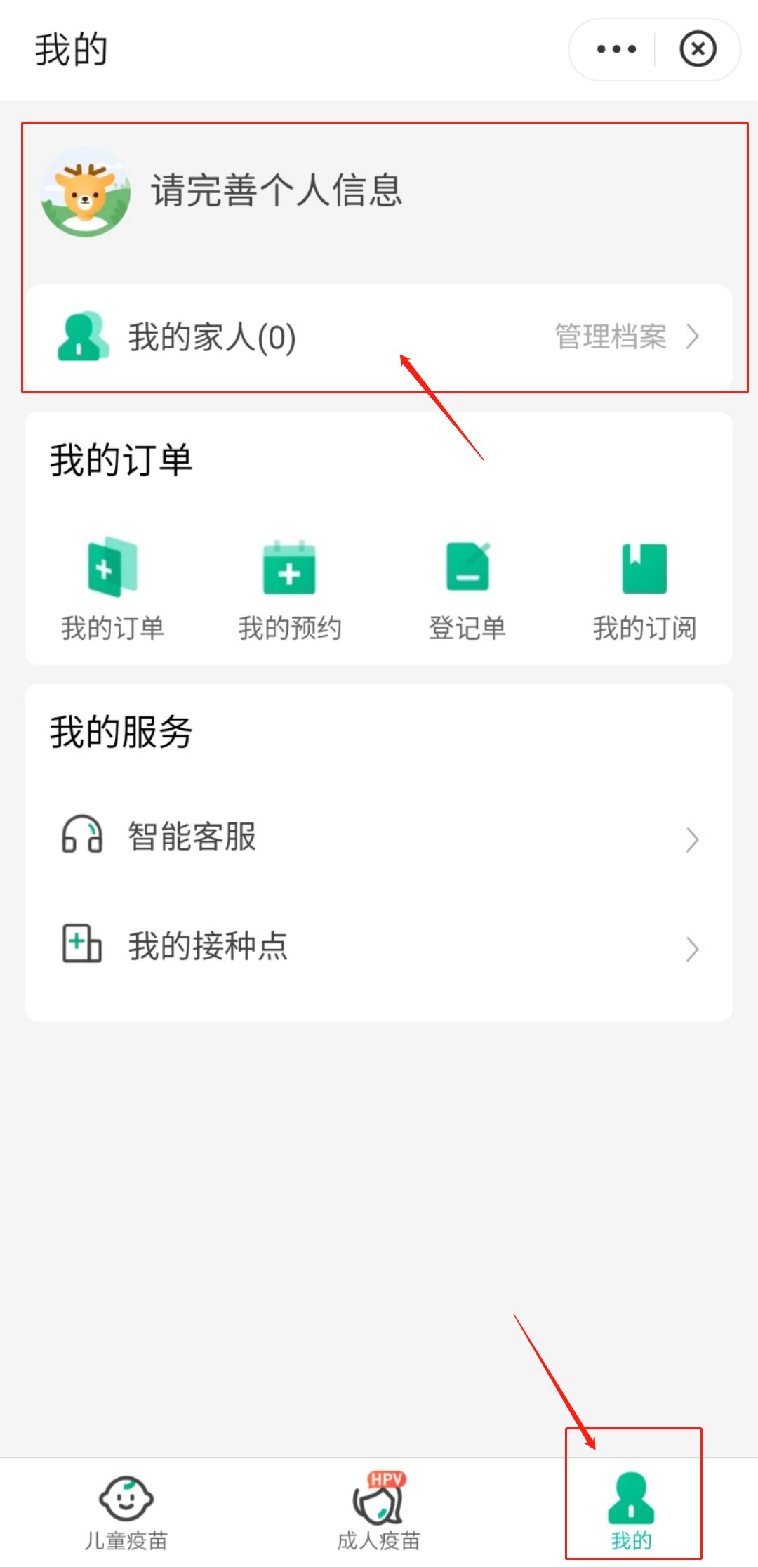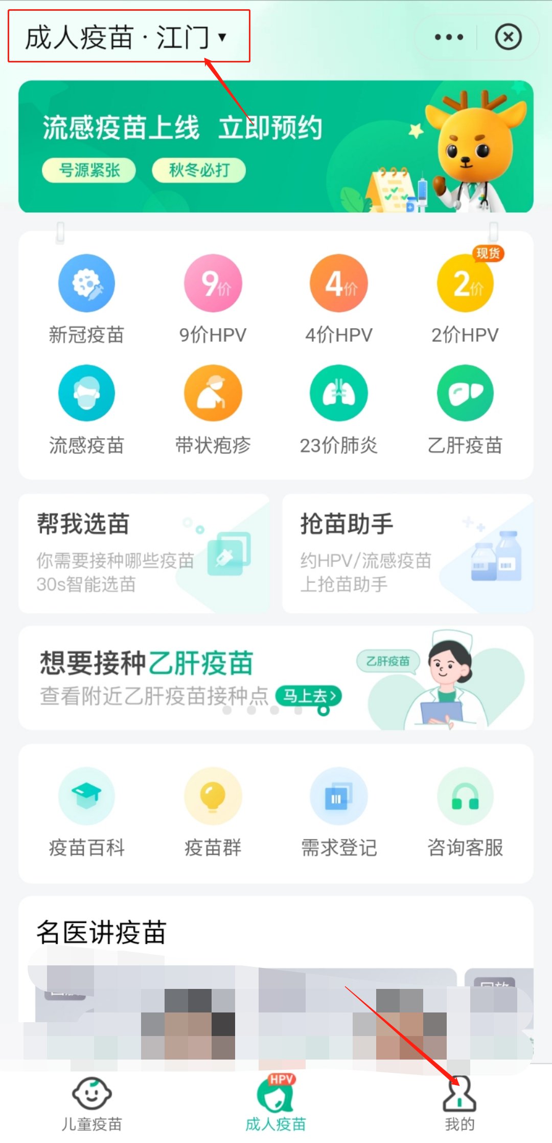 第四步:确定定位无误后,点击【我的】登录个人账号,完成后点击【成人疫苗】;