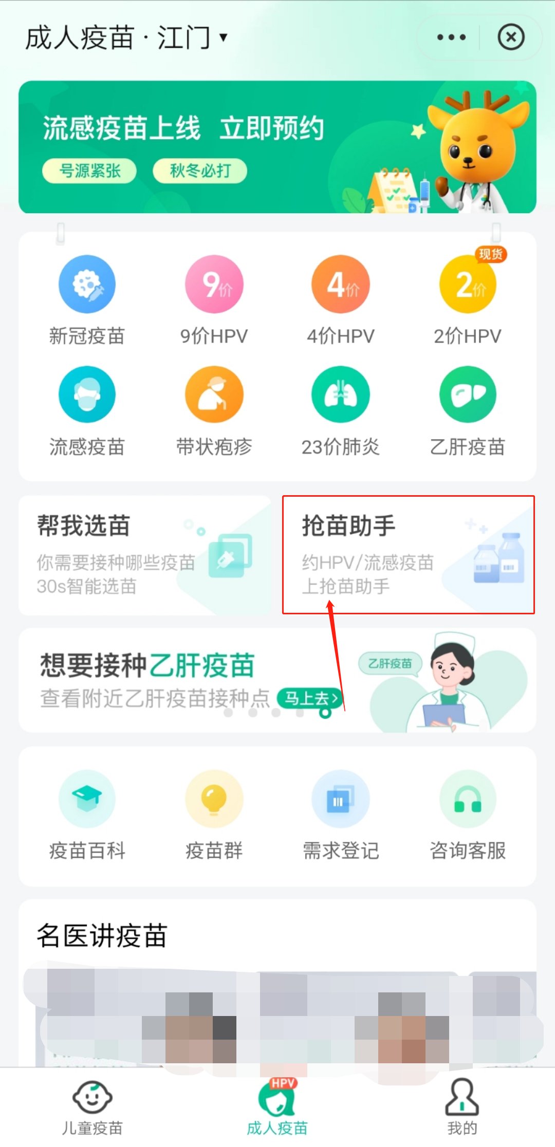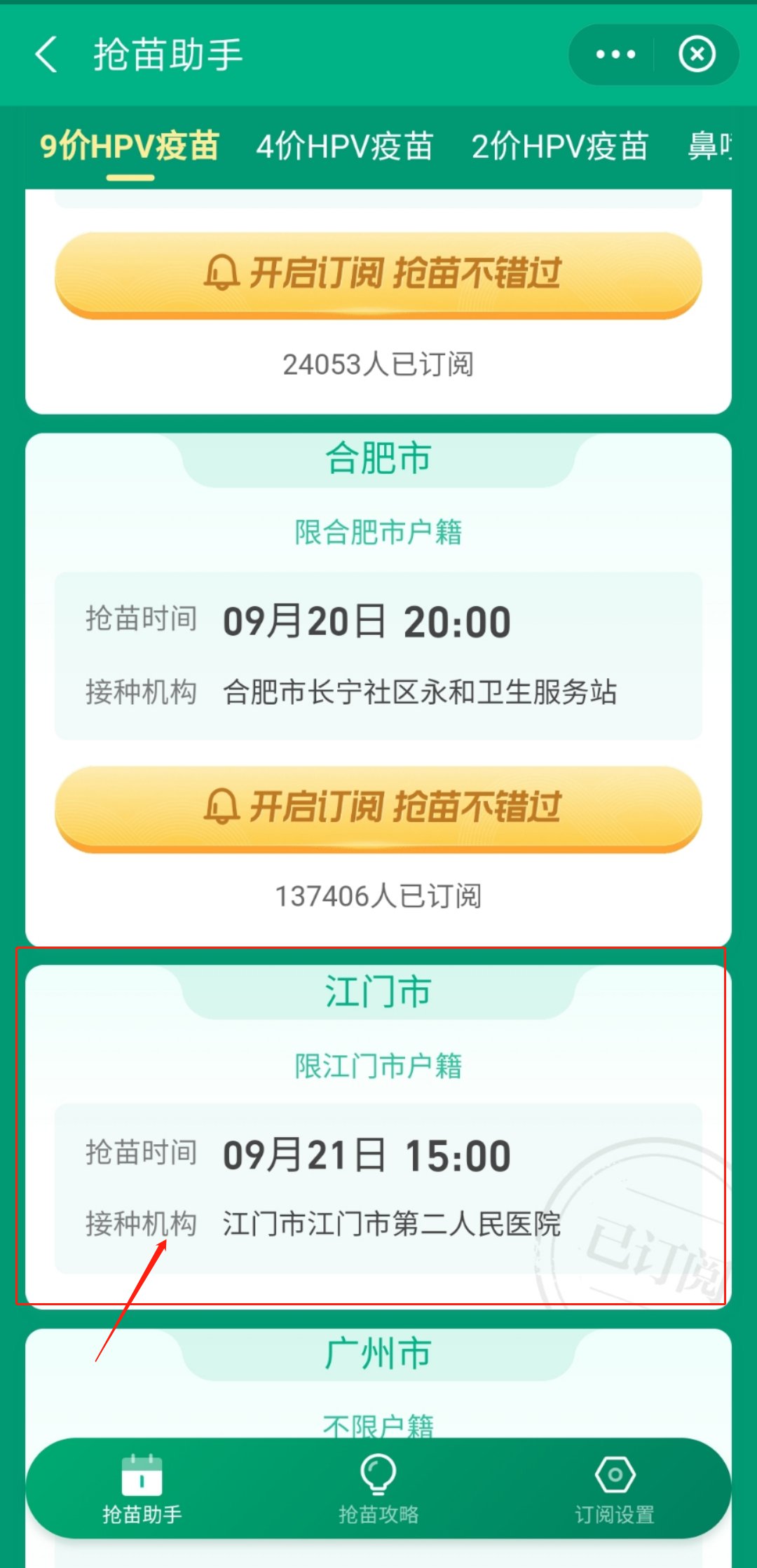 第五步:点击页面上的【抢苗助手】,进入后下拉页面,找到江门市第二人民医院,点击订阅即可。等到开放时间到了,即可开始预约。