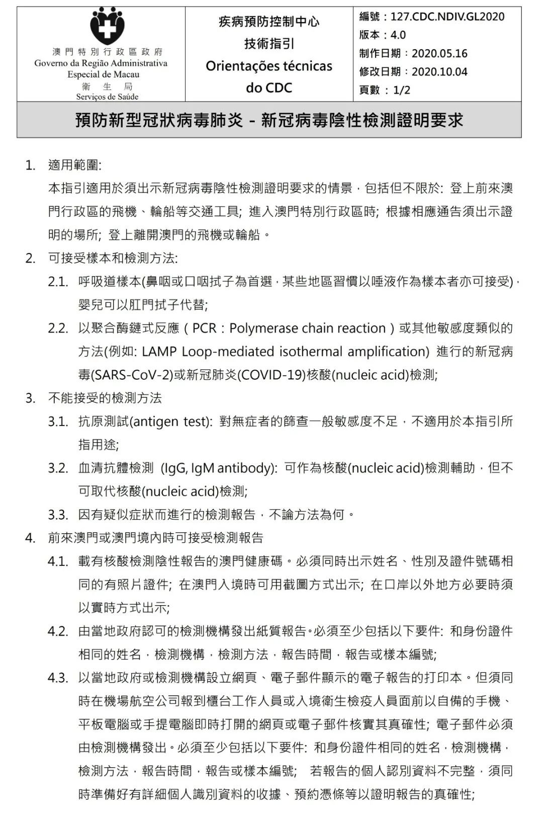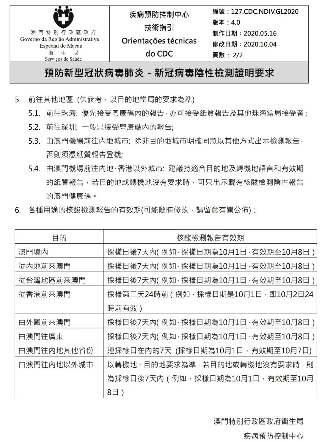 入境澳门时的核酸检测阴性证明可以经“粤康码”显示或出示纸质版。(具体要求请参考下图——澳门卫生局发出的“新冠病毒阴性检测证明要求指引”)