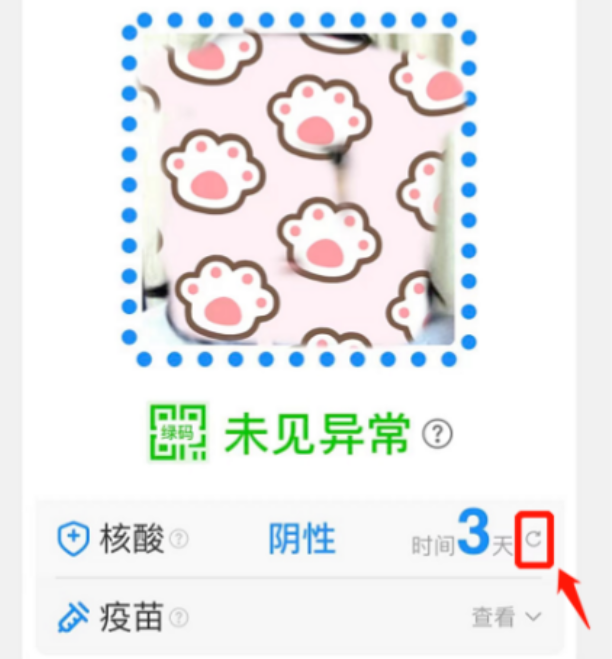 每日首次打开健康宝时,将为您查询最新的核酸检测记录,同时您也可以通过点击健康状态页面时间天数后面的小按键(图1中红框处)手动刷新,以获取最新检测结果。刷新功能设置了间隔期,即点击一次刷新按键后小图标将变灰,15分钟后方可再次点击刷新。